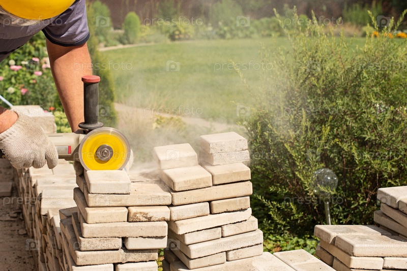 Мастер распиливает тротуарную плитку болгаркой-болгаркой. Пыль