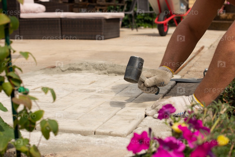 Мастер укладывает брусчатку слоями. Садовая кирпичная дорожка, мощенная профессиональным рабочим-укладчиком. Укладка бетонной тротуарной плитки во дворе дома на песчаный фундамент