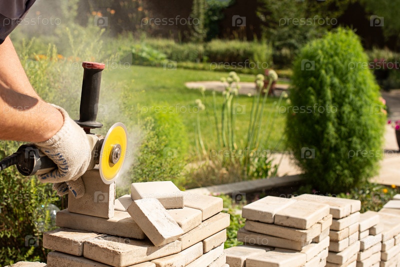 Мастер распиливает тротуарную плитку болгаркой-болгаркой. Пыль
