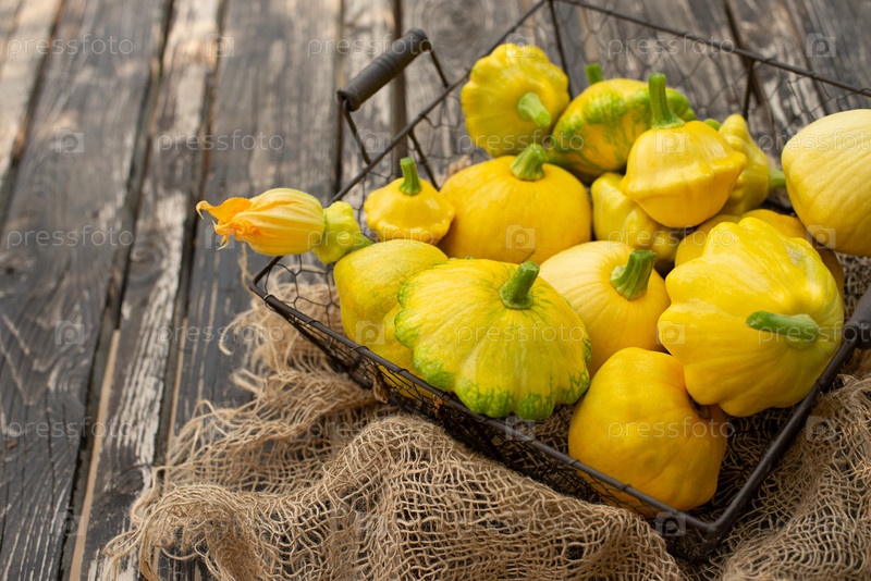 Патиссон, Сквош, тыква в форме тарелки, сырой овощ на темном деревянном фоне