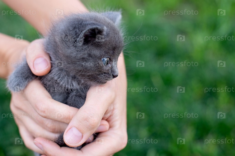 Серый котенок один месяц в руках. Кошка и газон снаружи. Копировать пространство