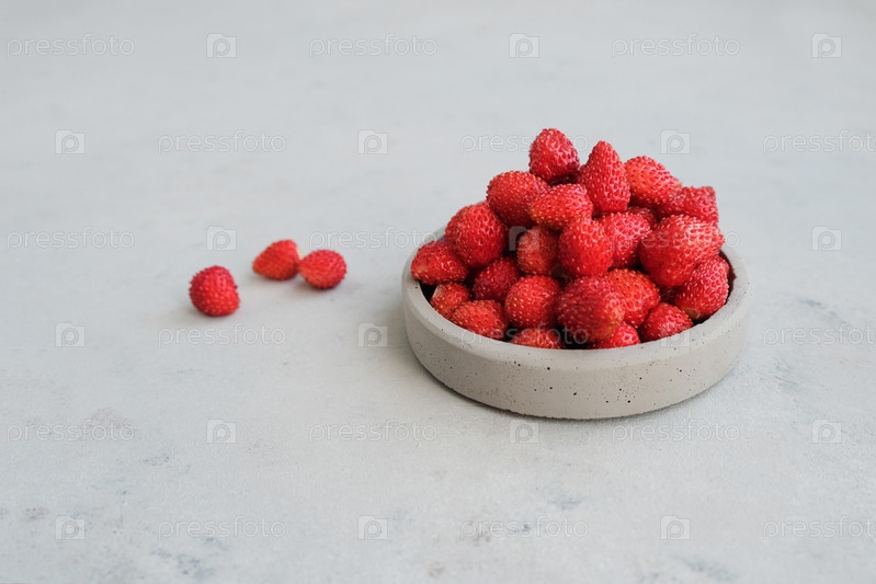 Красные ягоды земляники на сером бетонном фоне. Концепция лета в минимализме
