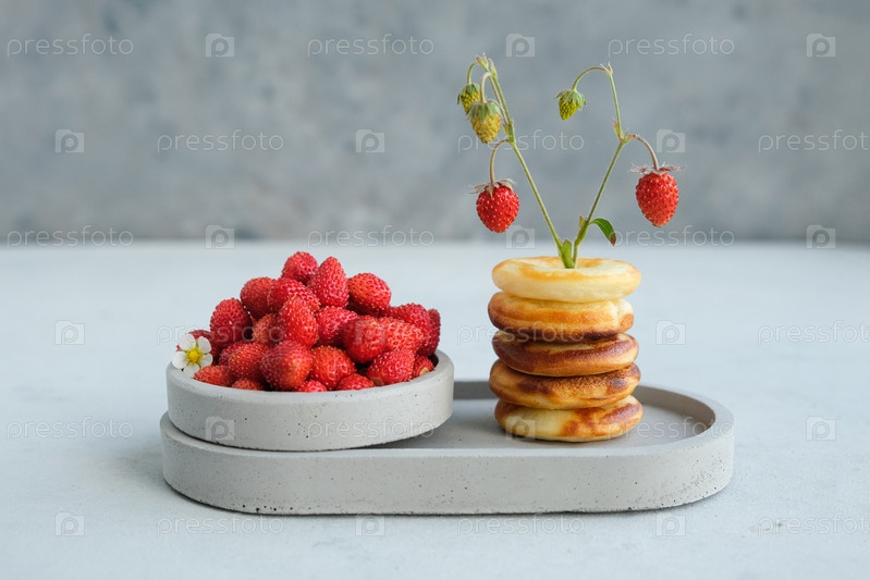 Круглый запеченный пончик с клубникой на сером бетонном фоне. Минимализм. Скопируйте пространство