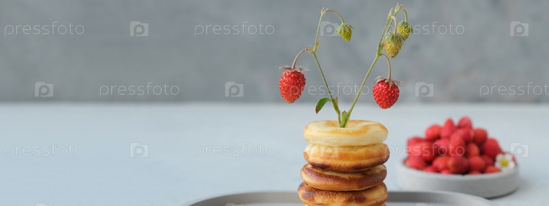 Баннер, Круглый запеченный пончик с клубникой на сером бетонном фоне. Минимализм. Скопируйте пространство