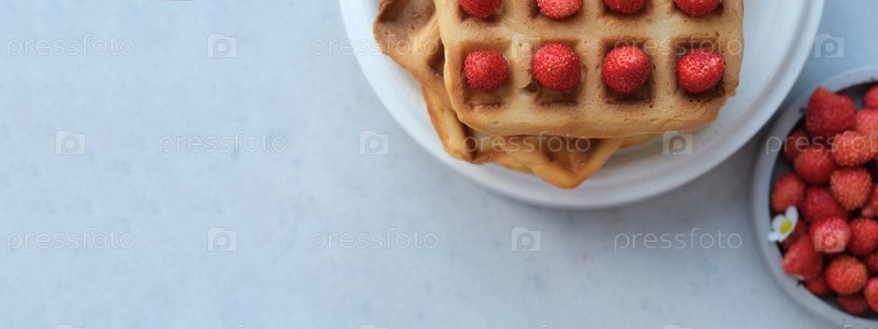 Баннер. Бельгийские или венские вафли с клубникой на минималистичном бетонно-сером фоне. вкусное сладкое блюдо, десертная закуска, концепция меню. скопируйте место для текста