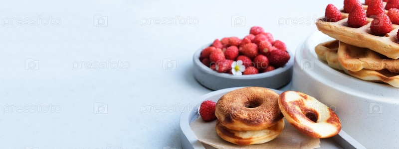 Баннер. Бельгийские или венские вафли с клубникой на минималистичном бетонно-сером фоне. вкусное сладкое блюдо, десертная закуска, концепция меню. скопируйте место для текста