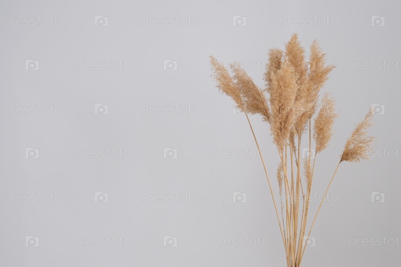 Пампасная трава на сером фоне. Стебель тростникового шлейфа, сушеная пампасная трава, декоративная цветочная композиция из перьев для дома, пляжная тема, новый модный домашний декор. Выборочный фокус