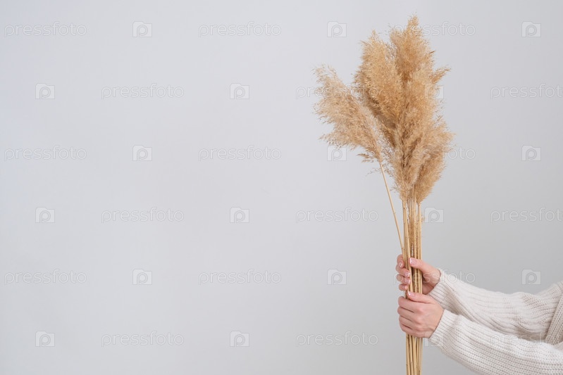 Рука женщины держит пампасную траву. Стебель тростникового шлейфа, сушеная пампасная трава, декоративная цветочная композиция из перьев для дома, новый модный домашний декор