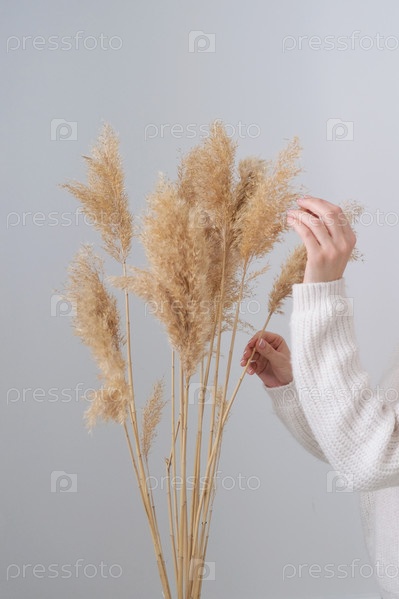 Рука женщины держит пампасную траву. Стебель тростникового шлейфа, сушеная пампасная трава, декоративная цветочная композиция из перьев для дома, новый модный домашний декор
