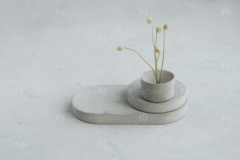 Пустой пьедестал или бетонный подиум для демонстрации продукта с сухими минималистичными цветами и листьями природы на зеленом фоне. Скопируйте пространство