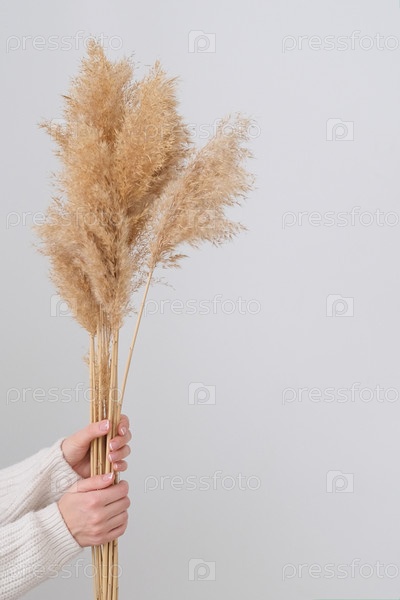 Рука женщины держит пампасную траву. Стебель тростникового шлейфа, сушеная пампасная трава, декоративная цветочная композиция из перьев для дома, новый модный домашний декор