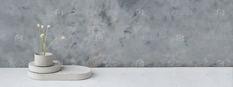 Баннер. Пустой пьедестал или бетонный подиум для демонстрации продукта с сухими минималистичными цветами и листьями природы на зеленом фоне. Скопируйте пространство