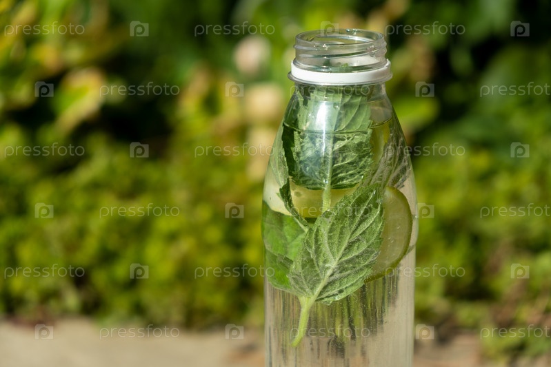Пластиковая бутылка с водой с листьями мяты и ломтиками лайма. освежающий летний напиток
