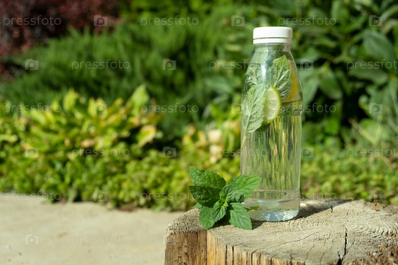 Пластиковая бутылка с водой с листьями мяты и ломтиками лайма. освежающий летний напиток