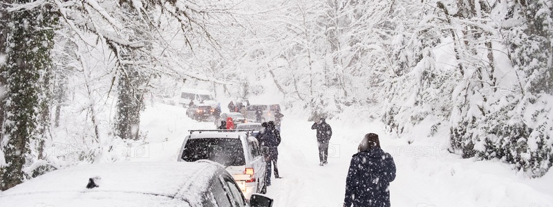 Россия, 4 января 2022 г. Пробка из-за сильного снегопада на горной и лесной дороге