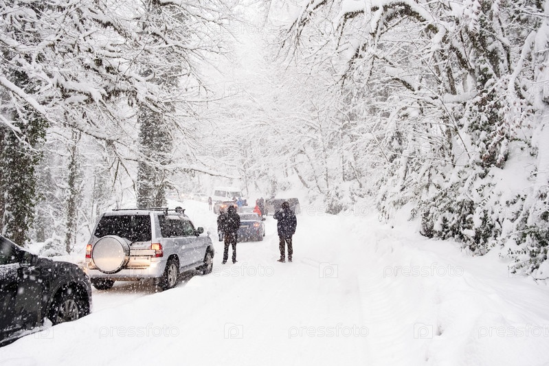 Россия, 4 января 2022 г. Пробка из-за сильного снегопада на горной и лесной дороге
