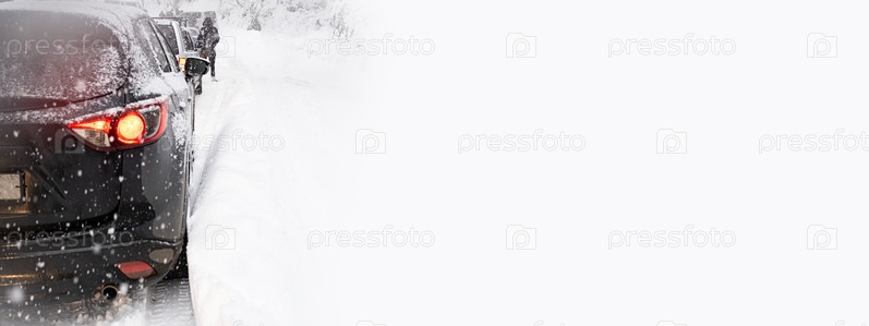 Россия, 4 января 2022 г. Пробка из-за сильного снегопада на горной и лесной дороге