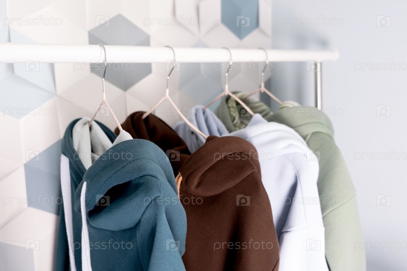 Ряд разноцветных вязаных толстовок, спортивных свитеров, висящих на вешалках в ателье или спортивной одежды розничного магазина крупным планом. пастельные холодные тона