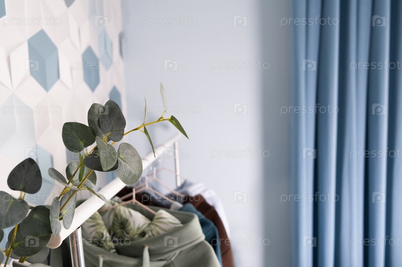 Ряд разноцветных вязаных толстовок, спортивных свитеров, висящих на вешалках в ателье или спортивной одежды розничного магазина крупным планом. пастельные холодные тона
