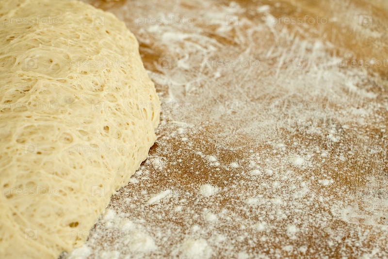 Дрожжевое тесто, лежащее на деревянной разделочной доске, посыпанной мукой