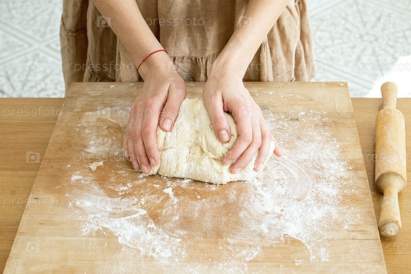 Дрожжевое тесто лежит на деревянной разделочной доске, посыпанной мукой