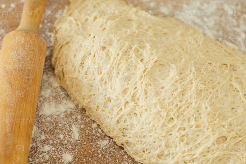Дрожжевое тесто лежит на деревянной разделочной доске, посыпанной мукой