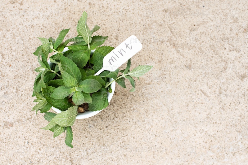 Листья мяты на бетонном фоне. Свежая ароматная трава. Табличка с надписью