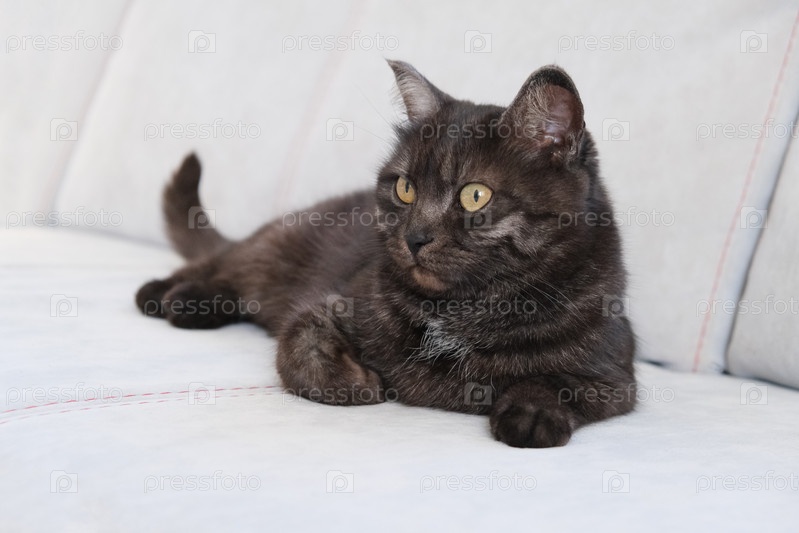 Портрет короткошерстной серо-голубой домашней кошки с большими желтыми глазами шотландской серой полосатой кошки. Очаровательный питомец с зеленым комнатным растением. Британский короткошерстный серый кот с большими широко открытыми оранжевыми глазами