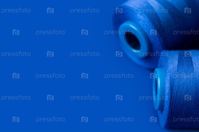 Текстура синей нити в катушке для шитья на простом синем фоне. крупным планом. выкройка материала для пошива одежды