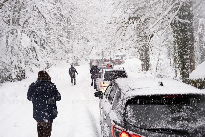 Россия, 4 января 2022 г. Пробка из-за сильного снегопада на горной и лесной дороге
