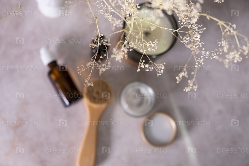 Средство по уходу за кожей для масляного массажа лица и цветов на белом столе. Экологически чистые органические многоразовые аксессуары для ухода за собой