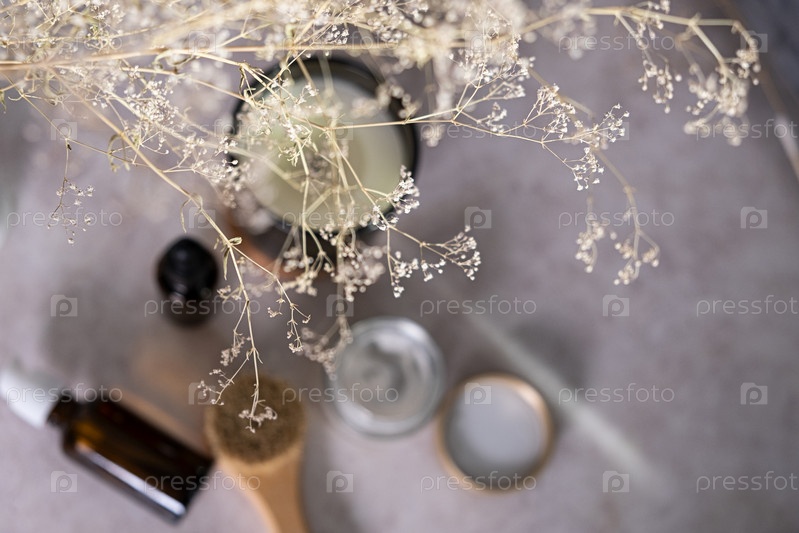 Средство по уходу за кожей для масляного массажа лица и цветов на белом столе. Экологически чистые органические многоразовые аксессуары для ухода за собой
