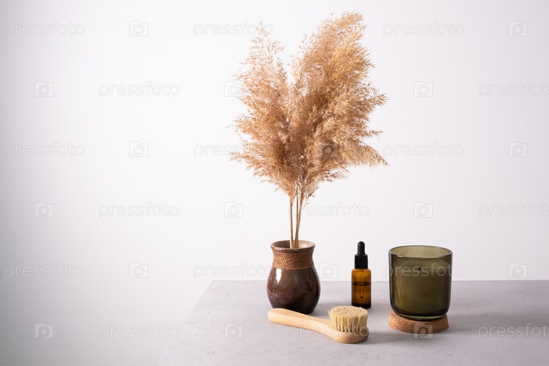 Средство по уходу за кожей для масляного массажа лица и цветов на белом столе. Экологически чистые органические многоразовые аксессуары для ухода за собой