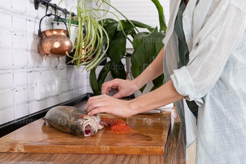 Женские руки режут филе красной рыбы. Красная икра. Удаление рыбьих костей. Разделка мяса красной рыбы. Концепция еды