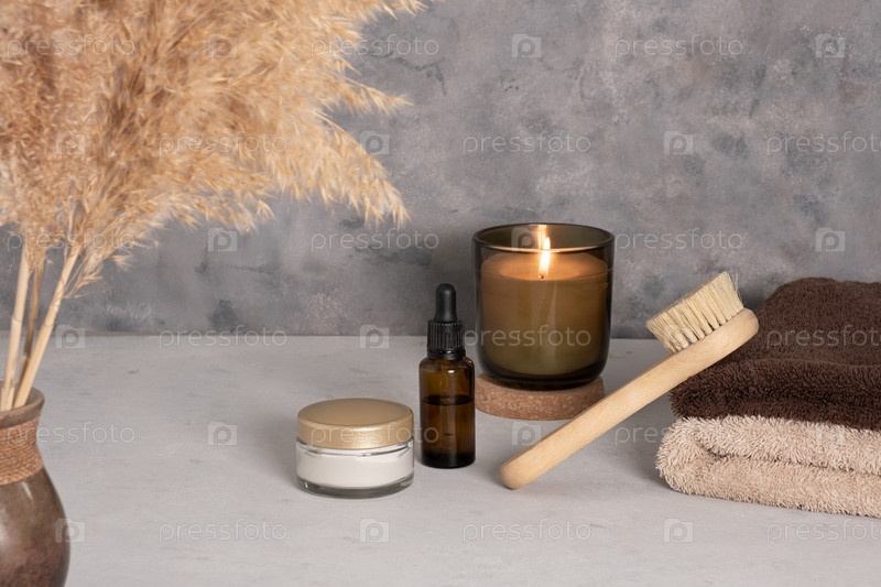 Средство по уходу за кожей для масляного массажа лица и цветов на белом столе. Экологически чистые органические многоразовые аксессуары для ухода за собой