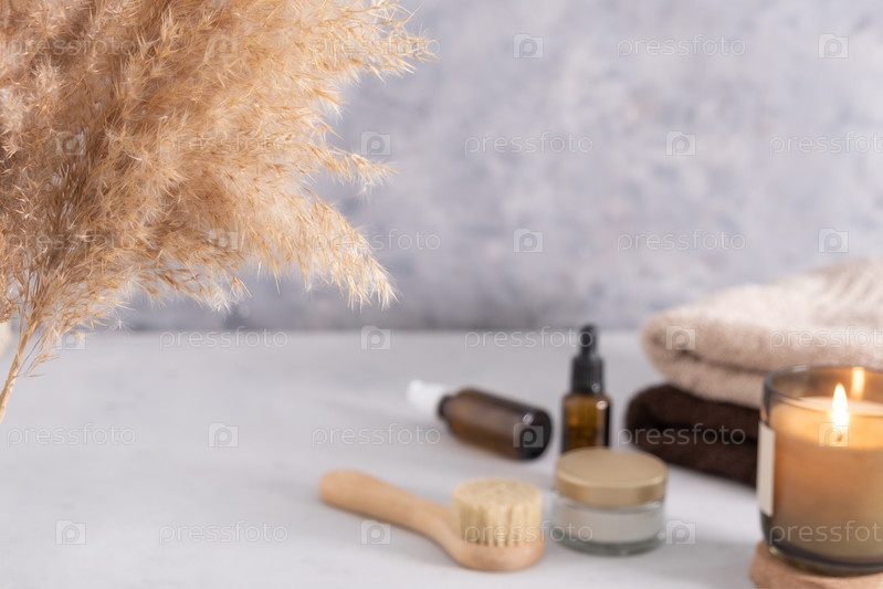 Средство по уходу за кожей для масляного массажа лица и цветов на белом столе. Экологически чистые органические многоразовые аксессуары для ухода за собой