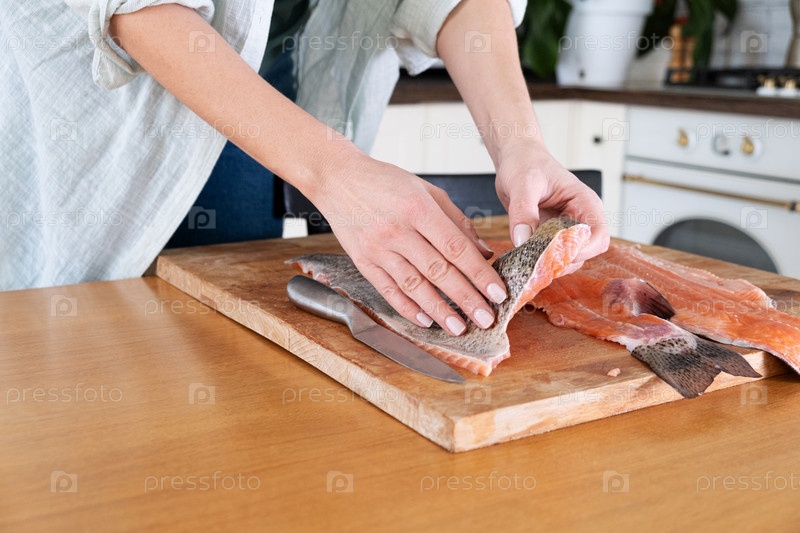 Женские руки режут филе красной рыбы. Красная икра. Удаление рыбьих костей. Разделка мяса красной рыбы. Концепция еды