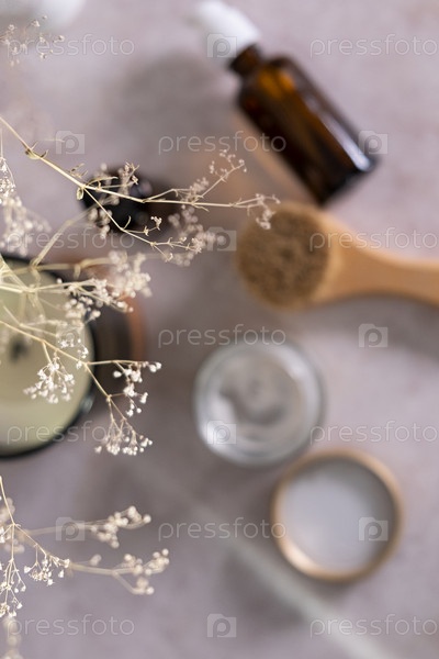 Средство по уходу за кожей для масляного массажа лица и цветов на белом столе. Экологически чистые органические многоразовые аксессуары для ухода за собой