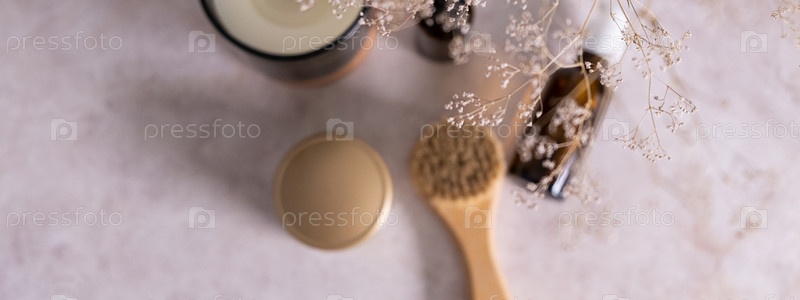 Бннер. Средство по уходу за кожей для масляного массажа лица и цветов на белом столе. Экологически чистые органические многоразовые аксессуары для ухода за собой