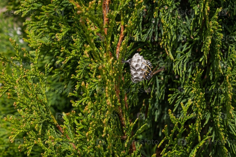 Оса на сотах на хвойном дереве туя смарагд. выборочный мягкий фокус