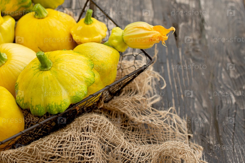 Патиссон, Сквош, тыква в форме тарелки, сырой овощ на темном деревянном фоне