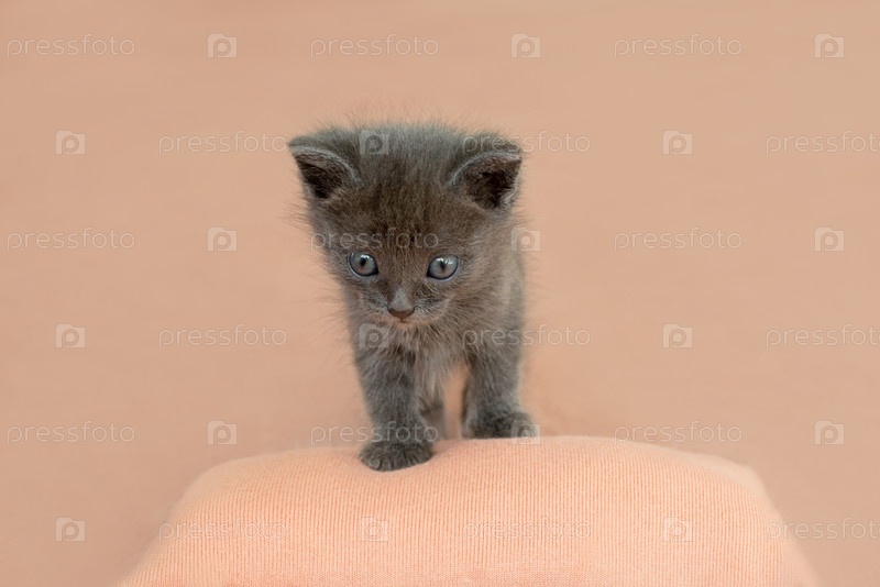 Серый котенок с когтями на розовой подушке
