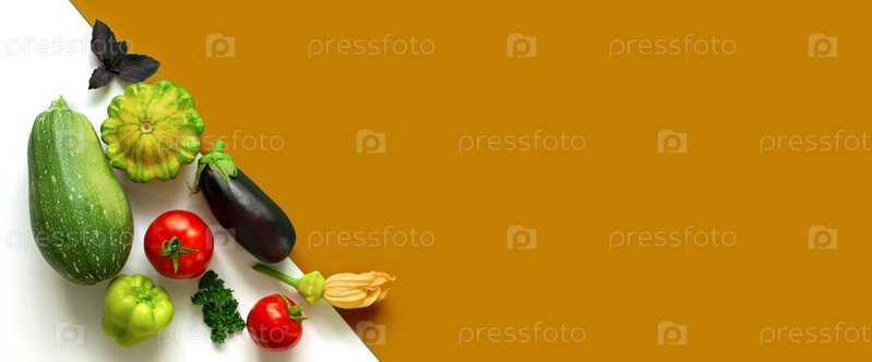 Баннер. Группа овощей выкладывается по диагонали. Минималистичная современная концепция дисплея. Урожай томатов, кабачков, кабачков