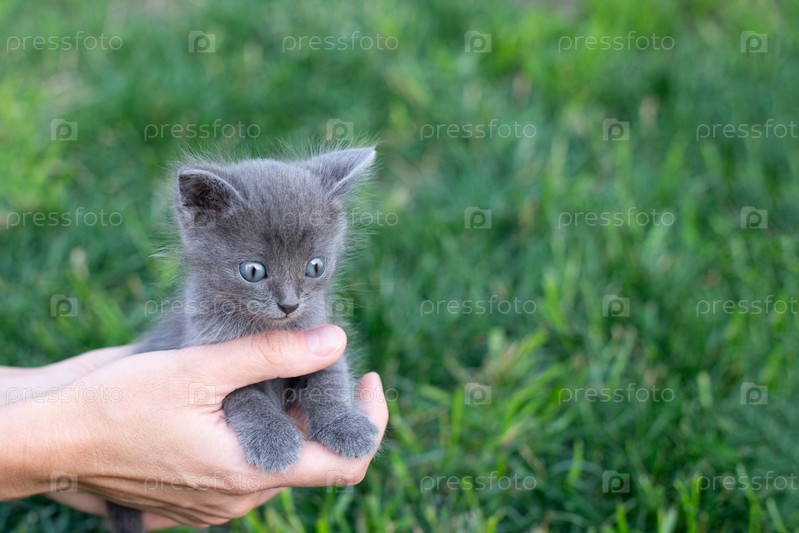 Серый котенок один месяц в руках. Кошка и газон снаружи. Копировать пространство