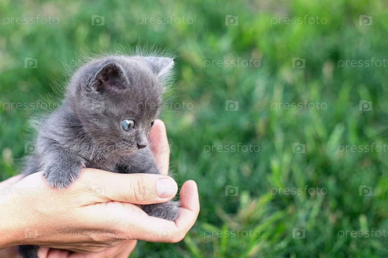 Серый котенок один месяц в руках. Кошка и газон снаружи. Копировать пространство