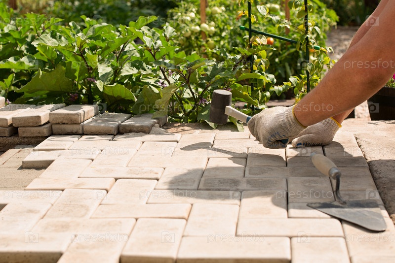 Мастер укладывает брусчатку слоями. Садовая кирпичная дорожка, мощенная профессиональным рабочим-укладчиком. Укладка бетонной тротуарной плитки во дворе дома на песчаный фундамент