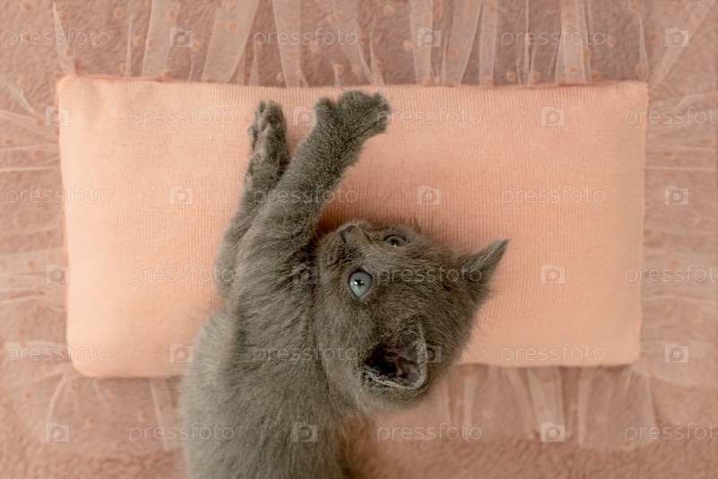 Серый котенок с когтями на розовой подушке