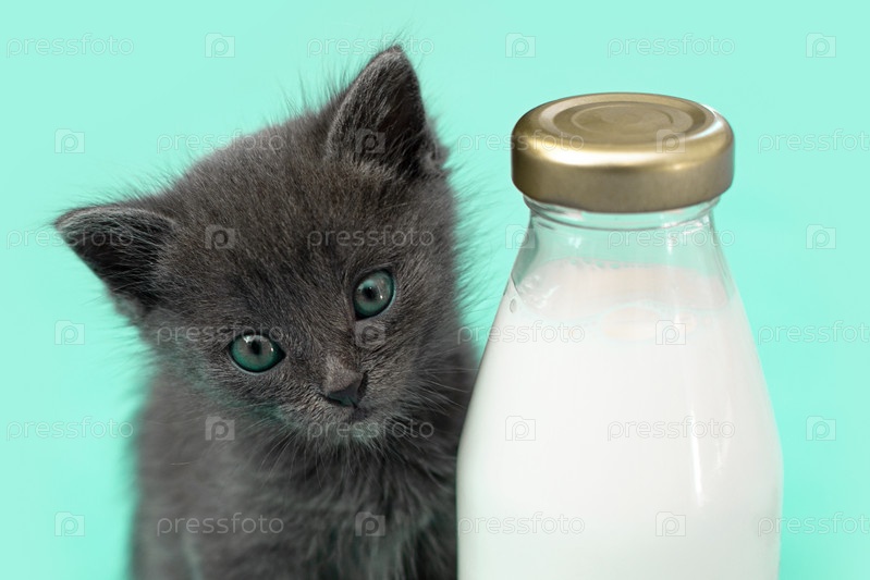 Котенок и бутылка молока. Серый кот с едой в корзине. Голубой фон. Скопируйте пространство