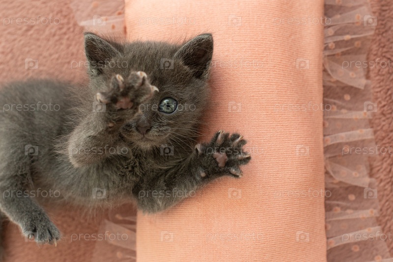 Серый котенок с когтями на розовой подушке
