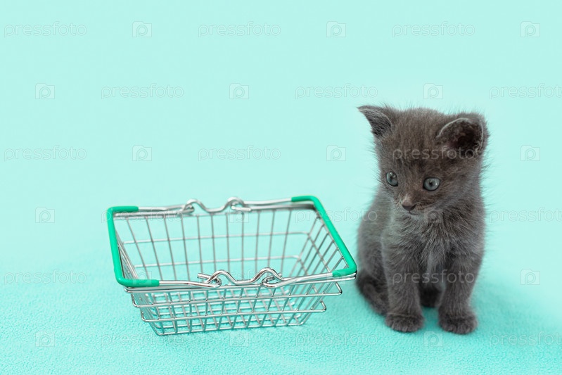 Серый котенок с корзиной для покупок. покупка животных. Зоомагазин